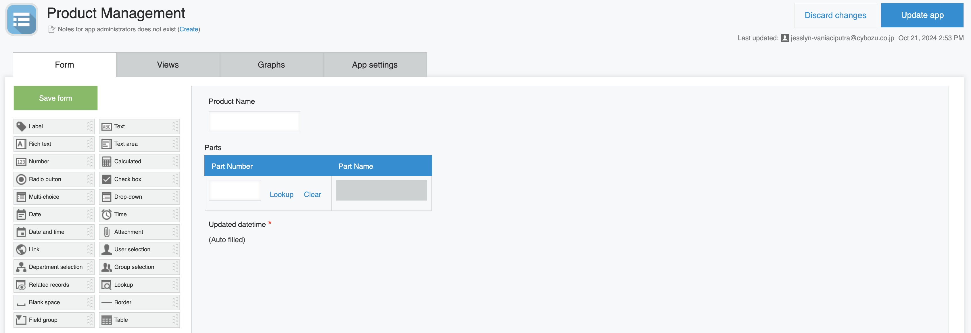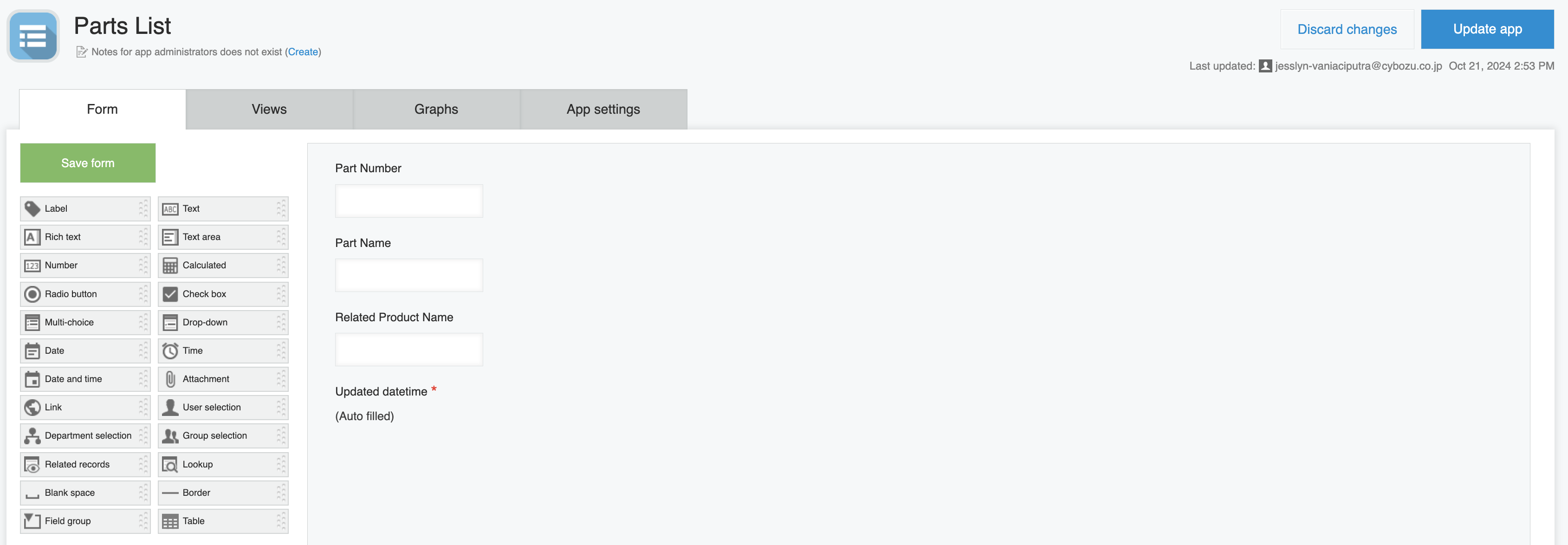 First, create a new Kintone App. Set the title to "Parts List" and set the fields as follows.