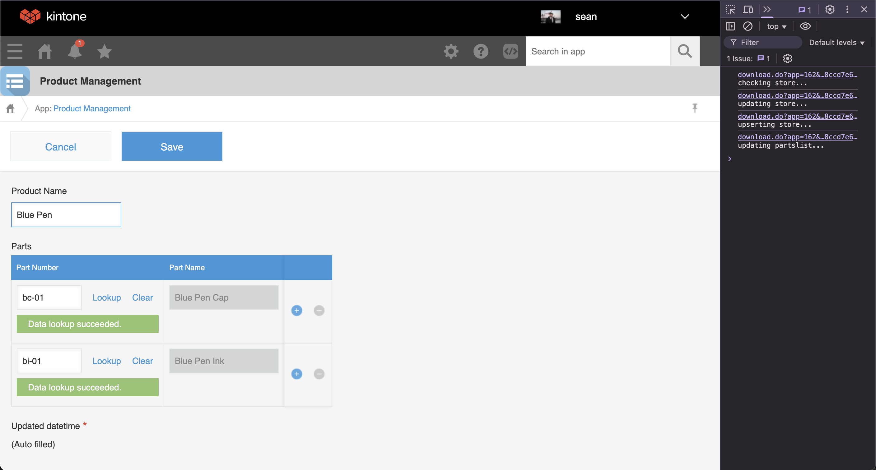 Using a Javascript customization, the records from the Parts List App will be saved locally to the browser, which will later be used to update the Product Management App. When editing or adding a record to the Product Management App, an API call is made to the Parts List App to check when the last update occurred. If there have been no updates, the local database is used. If the local database is outdated, it will be updated and then referenced by the Lookup field.