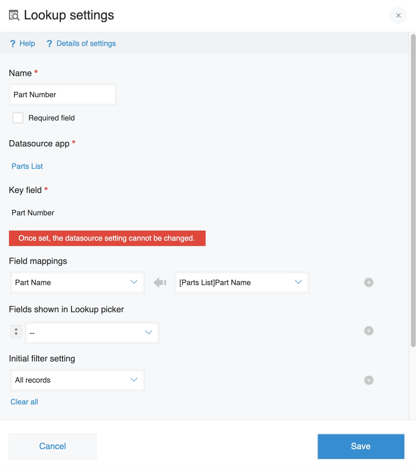 | Lookup | Part Number | Part_Number | Set the following settings: