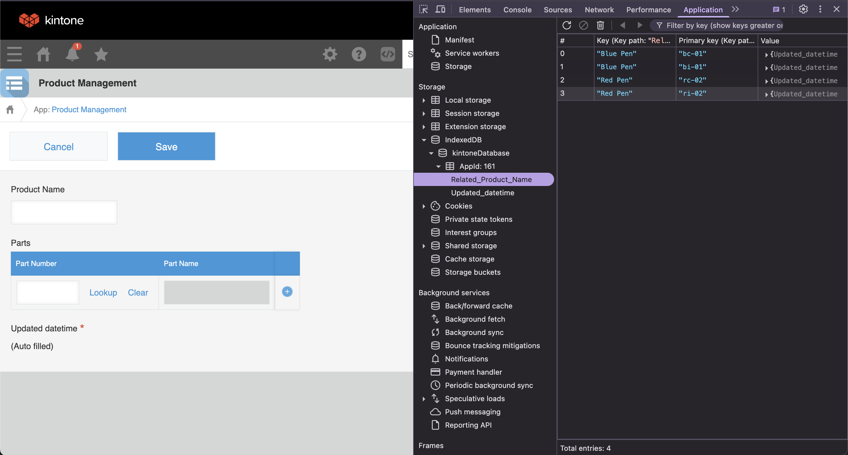 The customization has used internal API requests to retrieve and store the Parts List App records. This can be confirmed in the Browser Dev Tools > Application > IndexedDB > KintoneDatabase > AppId: {your App ID}.