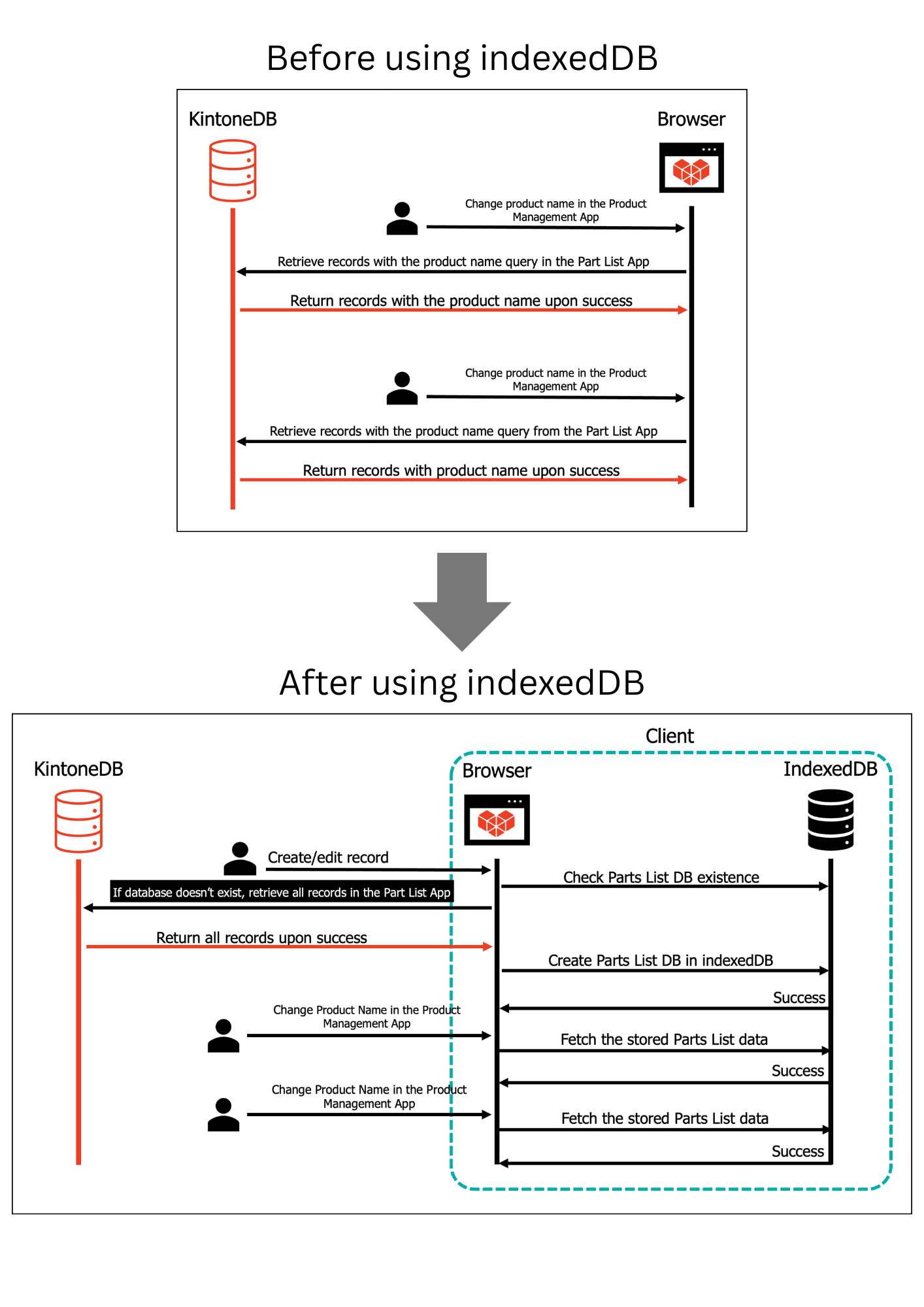When designing solutions with Kintone via its APIs, the API request rate limits must be considered for high-throughput systems. There are many design patterns for limiting the number of API requests in applications, one of which is client-side storage. In this article, the Indexed Database API, a.k.a. IndexedDB, is used to locally store changes from one Kintone App to reduce the number of API calls made in another App.